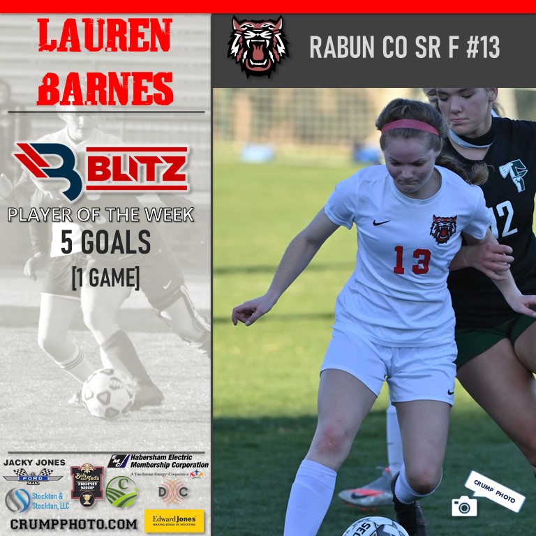 Rabun County’s Lauren Barnes had a 5-goal game last week, which honestly is no surprise with the illustrious career she has had. This is the senior forward’s third career POW award.