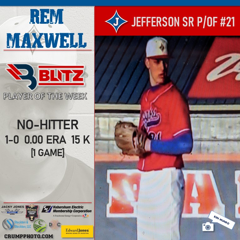 What a game last week by Jefferson’s Rem Maxwell. The senior pitcher/outfielder really shined on the bump, where he threw a 7-inning no-hitter against Chestatee while striking out 15 batters! That’s POW worthy! This is Maxwell’s second career POW award.