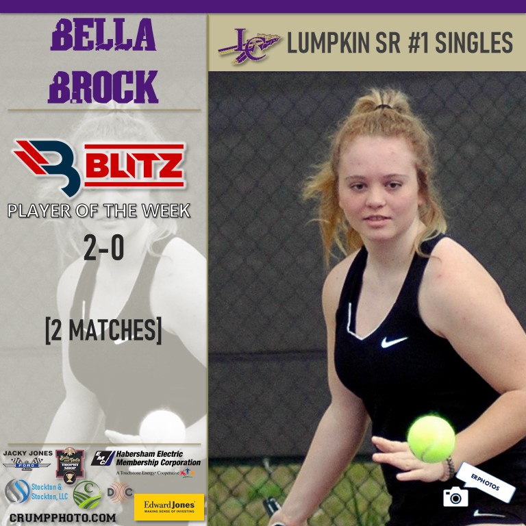 Lumpkin County #1 singles tennis standout Bella Brock was a perfect 2-0 for the region champion Lady Indians last week. This is Brock’s first POW award of her career.