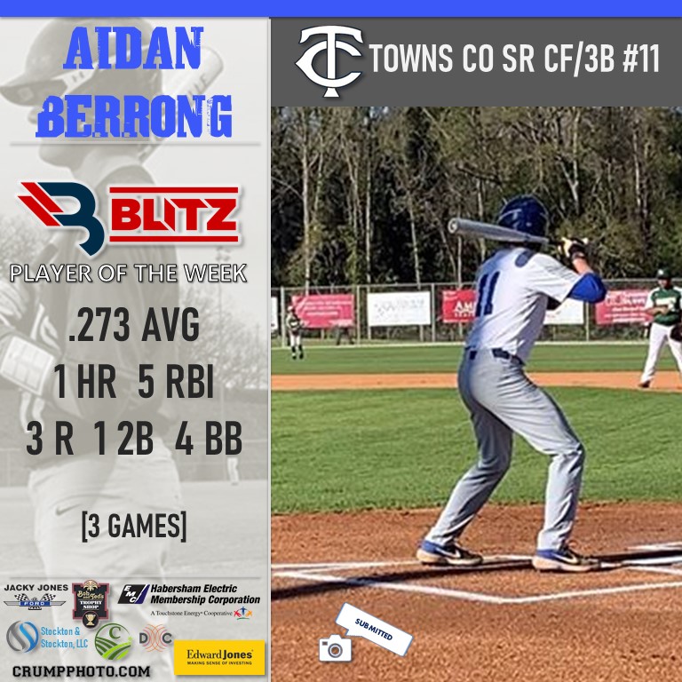 Towns County senior Aidan Berrong is back at it on the diamond. The 4-time BLITZ POW winner batted .273 last week across 3 games. That included a homerun, 5 RBI, 3 runs, a double, and 4 walks for the centerfielder/third baseman.
