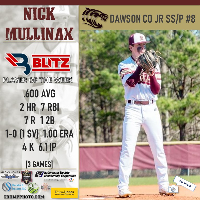 Dawson County junior shortstop/pitcher Nick Mullinax had a great week in 3 games last week. He hit .600 at the plate, tallying 2 homers, 7 RBI, 7 runs, and a double. On the bump, he was 1-0 with a 1.00 ERA, adding a save and 4 strikeouts across 6.1 innings of work. This is Mullinax’s first POW award.