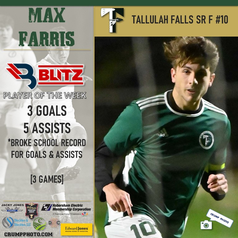 Tallulah Falls striker Max Farris broke the school’s single-season goals and assist records last week, and in one game put up 2 goals and 5 assists (single-game record). His single-season goals and assists marks are new school records. This is Farris’ second POW award this season.