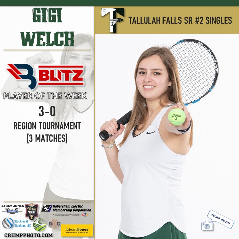 Tallulah Falls #2 singles senior Gigi Welch led TFS to a state playoff appearance for the first time. She was 3-0 across 3 region tournament matches last week, earning her first POW award.
