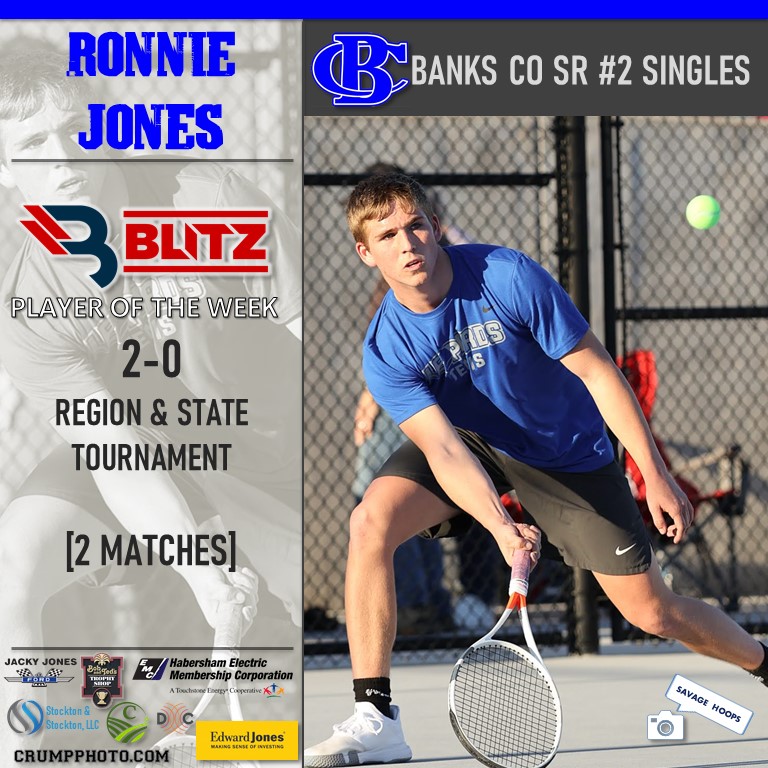 The Player of the Week Fan Vote for Girls/Boys Combined Tennis Player of the Week tallied 9,613 votes, with Banks County’s Ronnie Jones (5,664 votes) winning the Fan Vote. BLITZ then tabbed Tallulah Falls’ Gigi Welch as Co-POW.