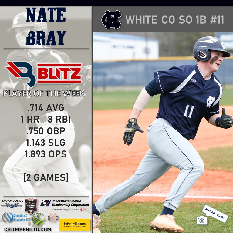 White County’s Nate Bray earns his second POW award this season after a monster 2-game performance last week. The Warriors’ sophomore first baseman hit .714 with a homerun and 8 RBI.