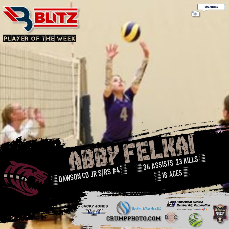 Dawson County’s Abby Felkai is new to the Lady Tigers program, and already making an immediate impact. She tallied 18 aces last week, and had 34 assists and 23 kills. The junior setter earns her first-ever POW award.