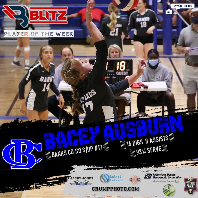 The BLITZ Volleyball Player of the Week Fan Vote tallied 59,310 total votes, with Banks County’s Bacey Ausburn taking 24,020 to win the POW. BLITZ then named Abby Felkai (Dawson) and Sarah Jennings (Tallulah Falls) co-POWs.