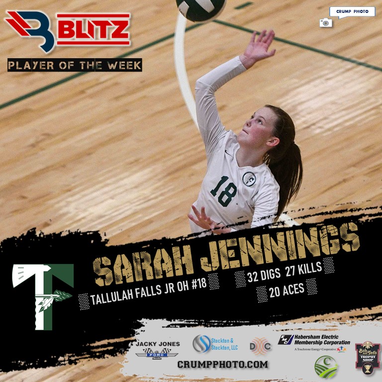 Tallulah Falls junior Sarah Jennings got off to a monster start to the 2021 season. The outside hitter picked up where she left off from last year, leading the Lady Indians in a 4-1 start with 32 digs, 27 kills, and 20 aces. This is Jennings’ second POW award of her career.