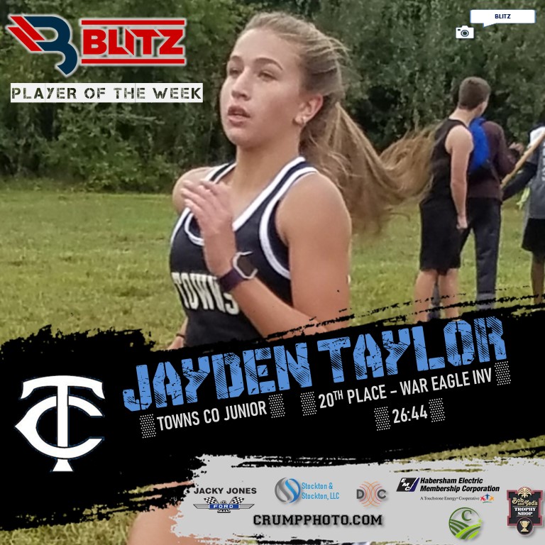 Towns County’s Jayden Taylor earns Runner of the Week honors after placing 20th overall at the War Eagle Inv. The junior timed in at 26:44. This is her third career POW award.