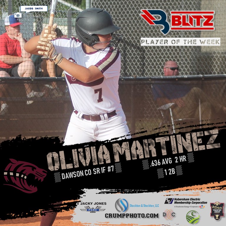 Olivia Martinez last won a POW award in her freshman season. It’s just by chance she hasn’t won one since, as she’s had a more than solid career. Last week, the Dawson County senior batted .636, going 7-for-11 with 2 HR, 7 RBI, and a double.