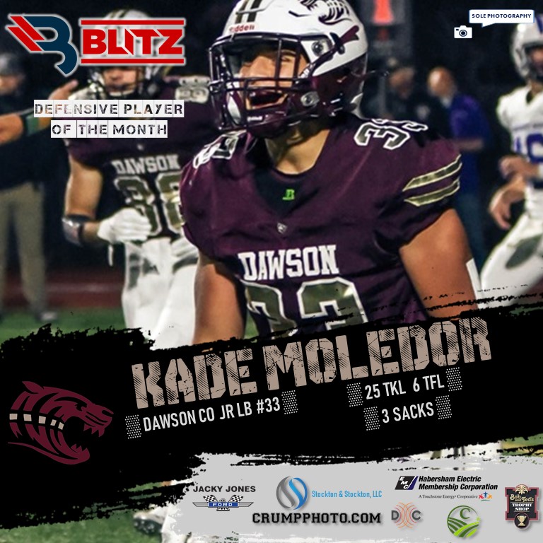 Throughout the 2021 season, 8 individuals will claim Defensive Player of the Month awards. After each 4-week stretch, we take nominations from coaches (or make our own based on each team’s top defensive player statistically). After putting it up for a public vote, we award the Fan Vote winner as well as the BLITZ pick. The BLITZ Defensive Football Player of the Month Fan Vote for Weeks 1-4 collected 31,171 total votes, with Dawson County’s Kade Moledor taking 16,602 to win the Fan Vote. BLITZ then named Malaki Starks (Jefferson) as co-POM.