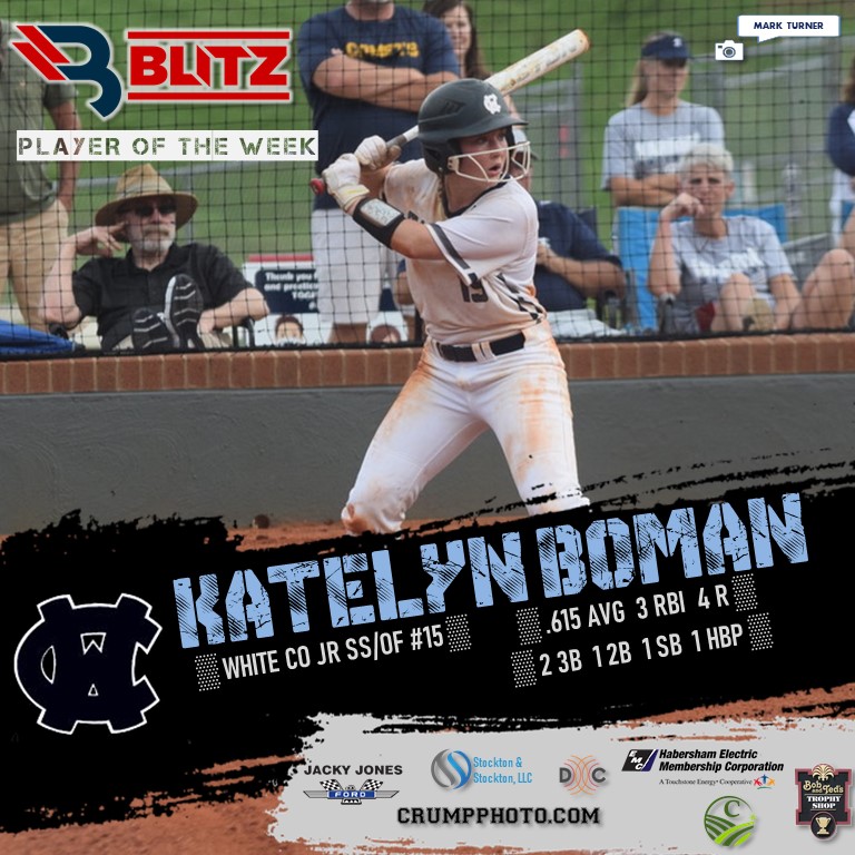 The BLITZ Softball Player of the Week Fan Vote tallied some 26,396 total votes, with White’s Katelyn Boman taking 10,548 to win the POW Fan Vote. BLITZ then named Dawson County’s Layne Bailey as co-POW.