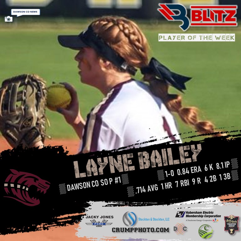 For the second time this season, Dawson County’s Layne Bailey earns POW status. The sophomore pitcher was 1-0 in the circle with a miniscule 0.84 ERA and 6 strikeouts in 8.1 innings of work. She hit .714 as well, going 10-for-14 at the plate. That included a homerun, 7 RBI, 9 runs, 4 doubles, and a triple. This is Bailey’s second career POW award.
