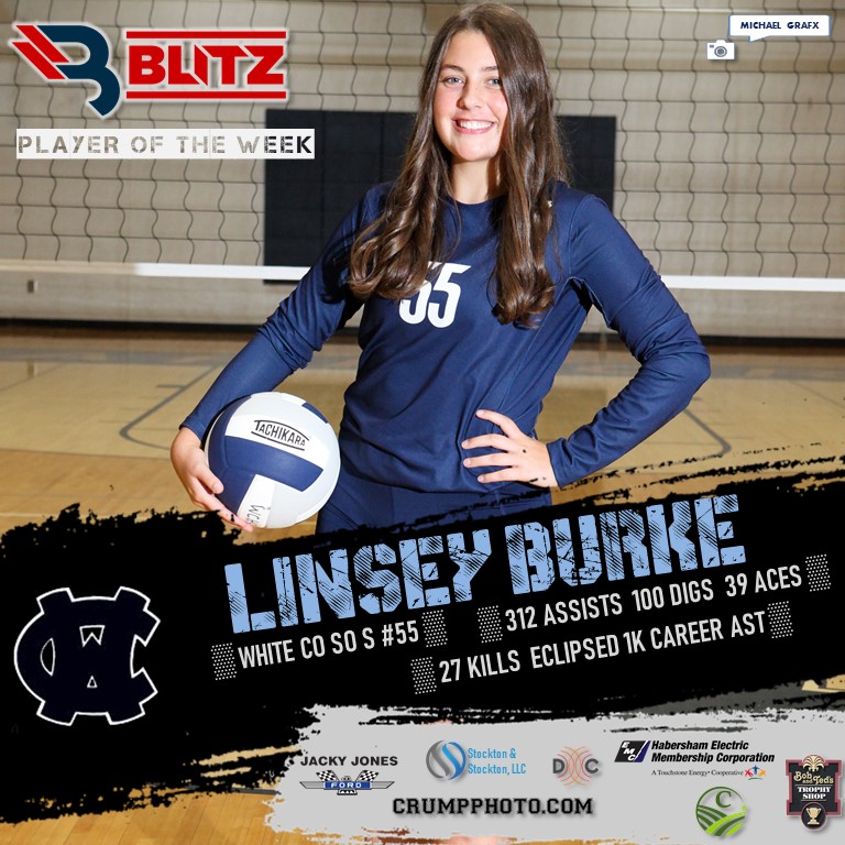 The BLITZ Volleyball Player of the Week Fan Vote tabulated 33,936 total votes, with White County’s Linsey Burke taking 16,427 to win the POW Fan Vote. BLITZ then named Madison Adams (Banks) co-POW.