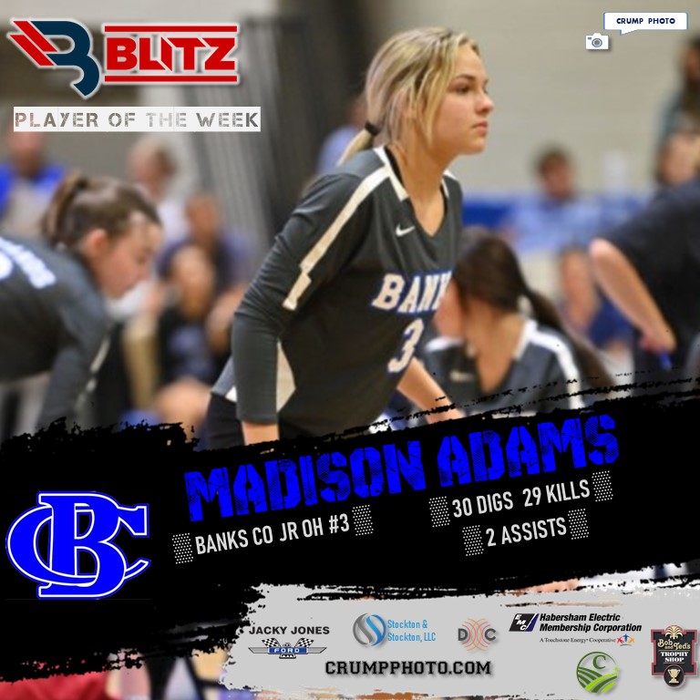 Madison Adams was clutch for Banks County last week in matches played. The junior posted 30 digs, 29 kills, and 2 assists to earn her first-ever POW award.