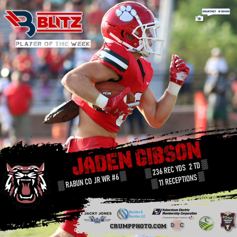 Jaden Gibson put up a career-high 236 receiving yards in a Wildcats win over Banks County. He hauled in 11 catches and had a pair of TD. He actually had a third that got called back. His 236 yards is 37th most in a game in state history. For the season, Gibson now has 51 receptions for 1,202 yards (tops in the state in all classifications) and 11 TD. This is Gibson’s second POW award of the season and fourth of his career.