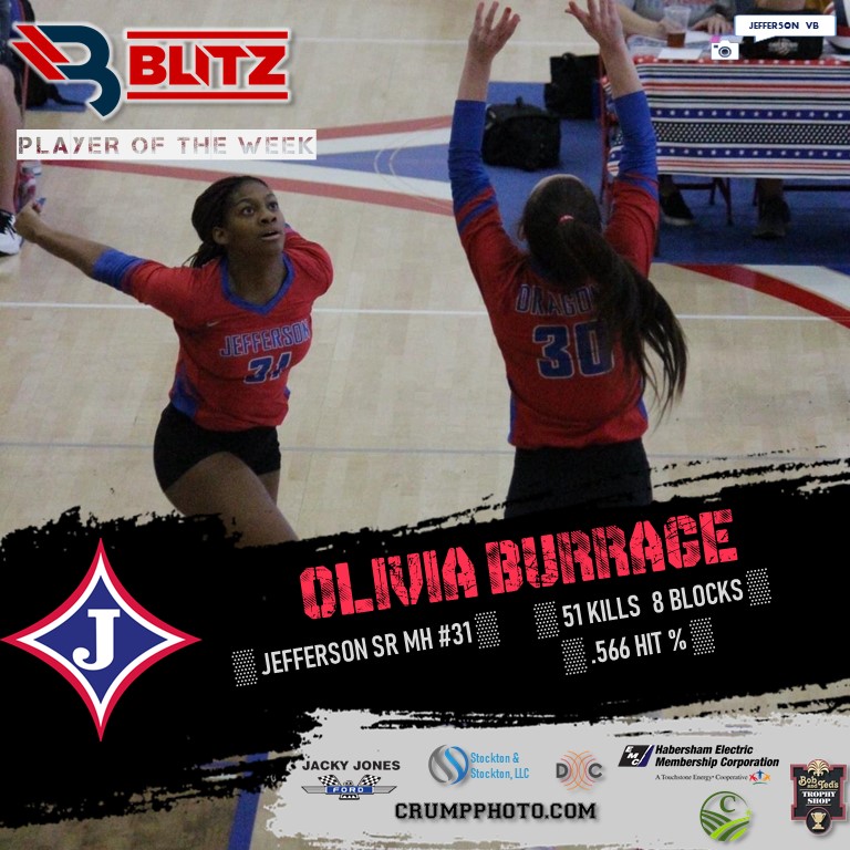 Olivia Barrage earns her first POW award after a ridiculous stat line that includes 51 kills, 8 blocks, and a .566 hit percentage. The Jefferson senior middle hitter has been a key part of the Lady Dragons’ season.