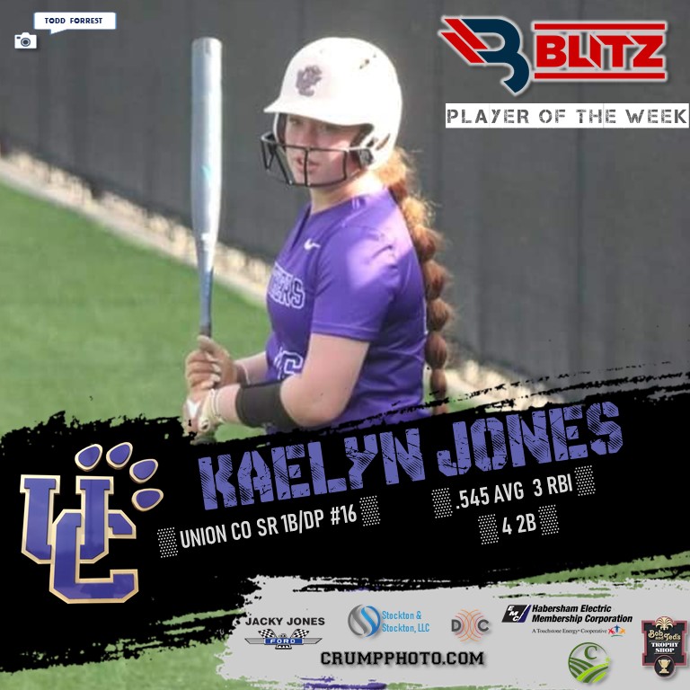 Union County senior Kaelyn Jones earns her first POW award after guiding the Lady Panthers to a first round win in the playoffs. The first baseman and designated player batted .545 with 3 RBI and 4 doubles.