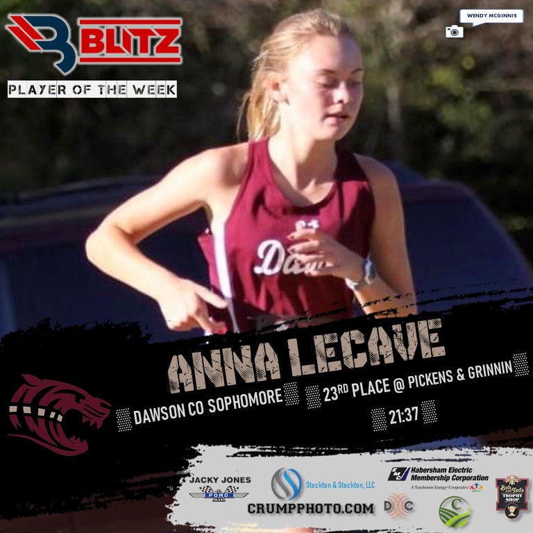 Dawson County sophomore sensation Anna LeCave continued her impressive 2021 season with a 23rd place finish at the Pickens and Grinnin meet. LeCave came in at 21:37, earning her second POW award of the season and third of her career.