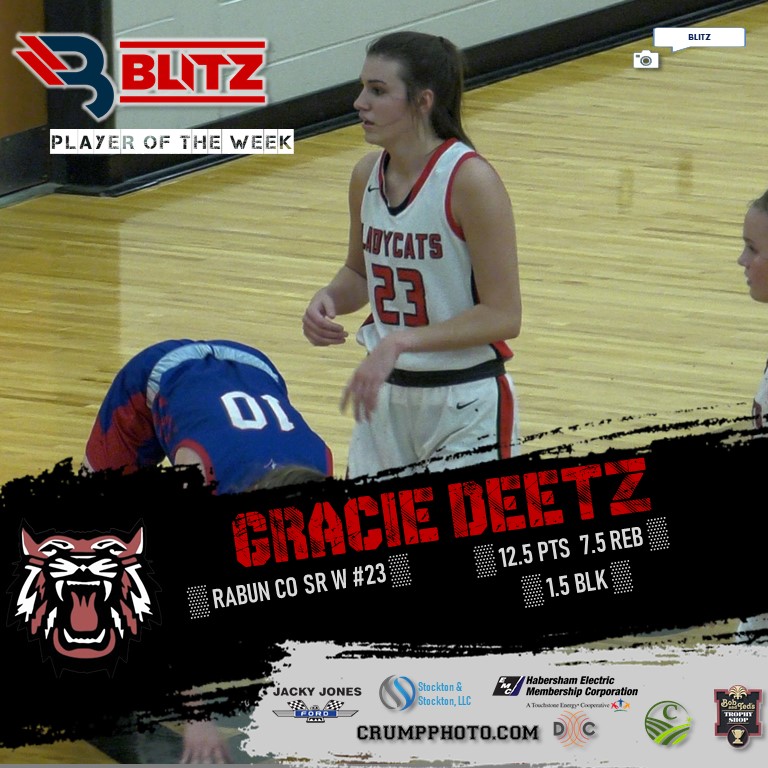 Gracie Deetz lays claim to her second POW award of the year (one in volleyball) and 4th of her career in total. The senior wing averaged 12.5 points and 7.5 boards across 2 games for the Lady Wildcats last week, including 1.5 blocks per game.