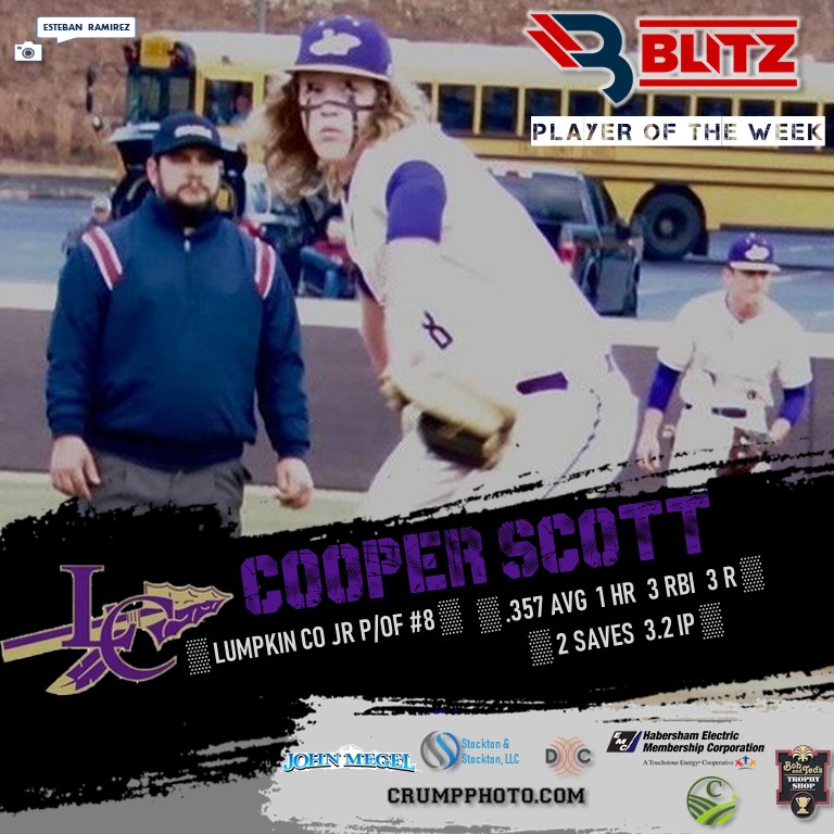 The BLITZ Baseball Player of the Week fan vote collected 12,538 total votes. The top vote-getter was Habersham Central’s Hunter Tatum with 6,513. BLITZ then chose Lumpkin County’s Cooper Scott as co-POW.