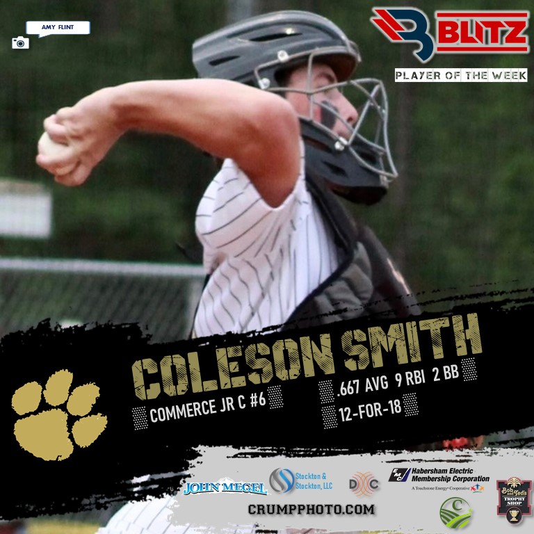 Coleson Smith put together a standout 5-game performance for the Commerce Tigers last week. The junior catcher was 12-for-18, which registers as a .667 average. He had 9 RBI and 2 walks as well, earning his first-ever POW award.