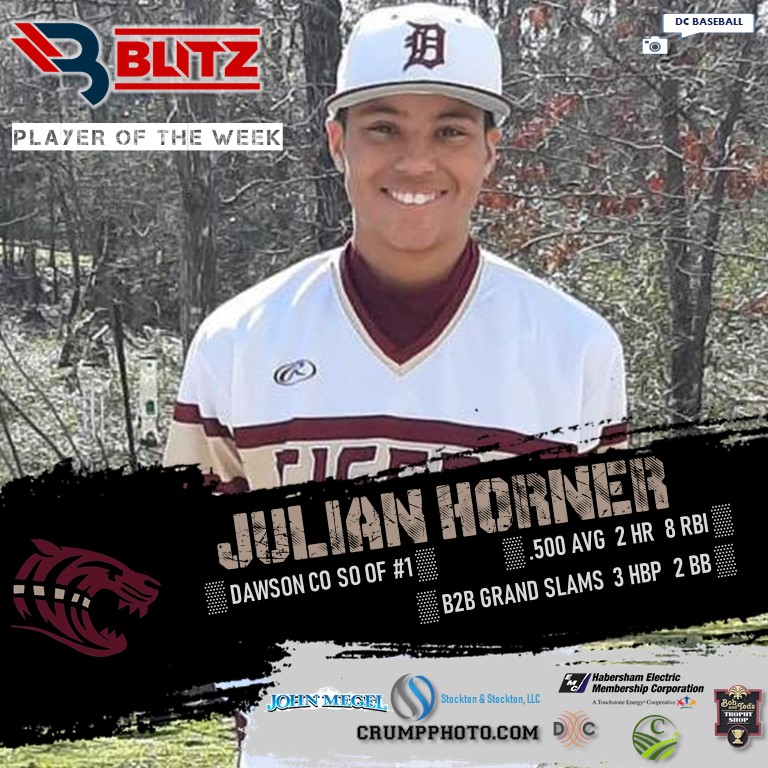 The BLITZ Baseball Player of the Week fan vote collected 24,414 total votes. The top vote-getter was Union County’s Thomas Dyer with 10,118. BLITZ then chose Dawson County’s Julian Horner as Co-POW.