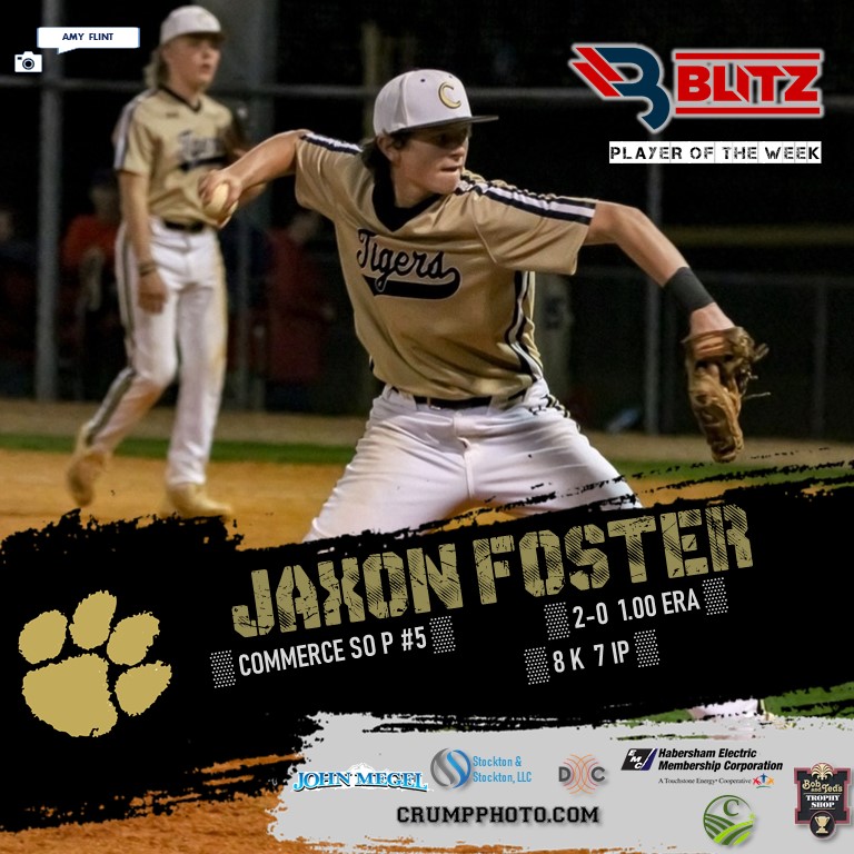 The BLITZ Baseball Player of the Week fan vote collected 6,821 total votes. The top vote-getter was Commerce’s Jaxon Foster with 4.388. BLITZ then chose White County’s Jake Johnson as Co-POW.