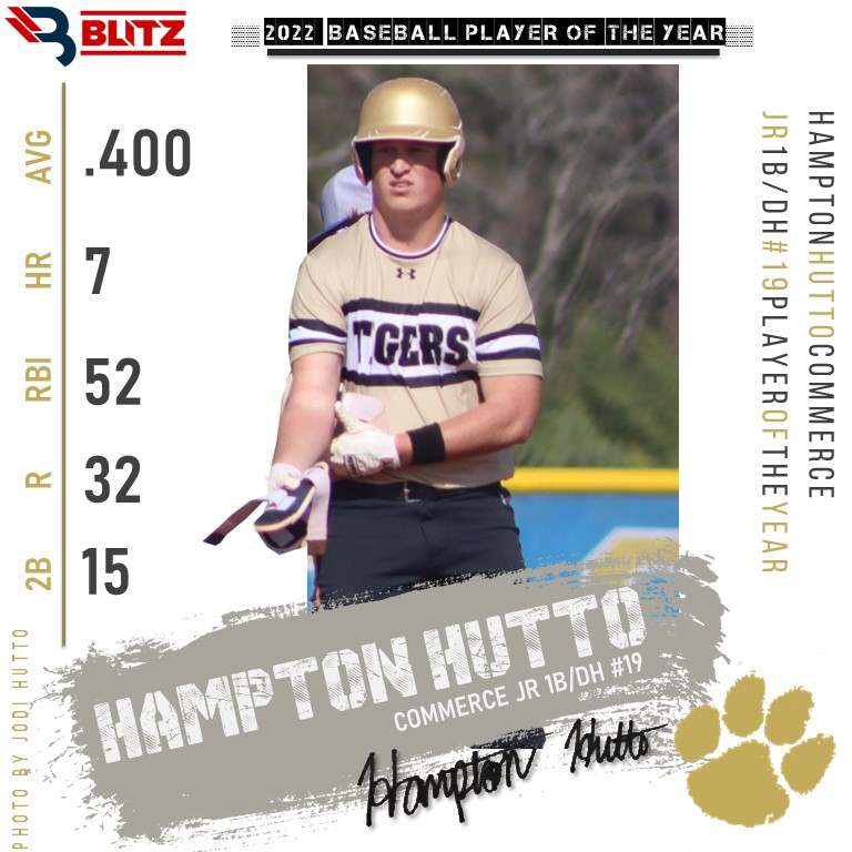 The BLITZ Baseball Player of the Year goes to Hampton Hutto of Commerce. The junior was phenomenal throughout the Tigers’ historic run to the Final Four, and he proved to be the best player in the area.