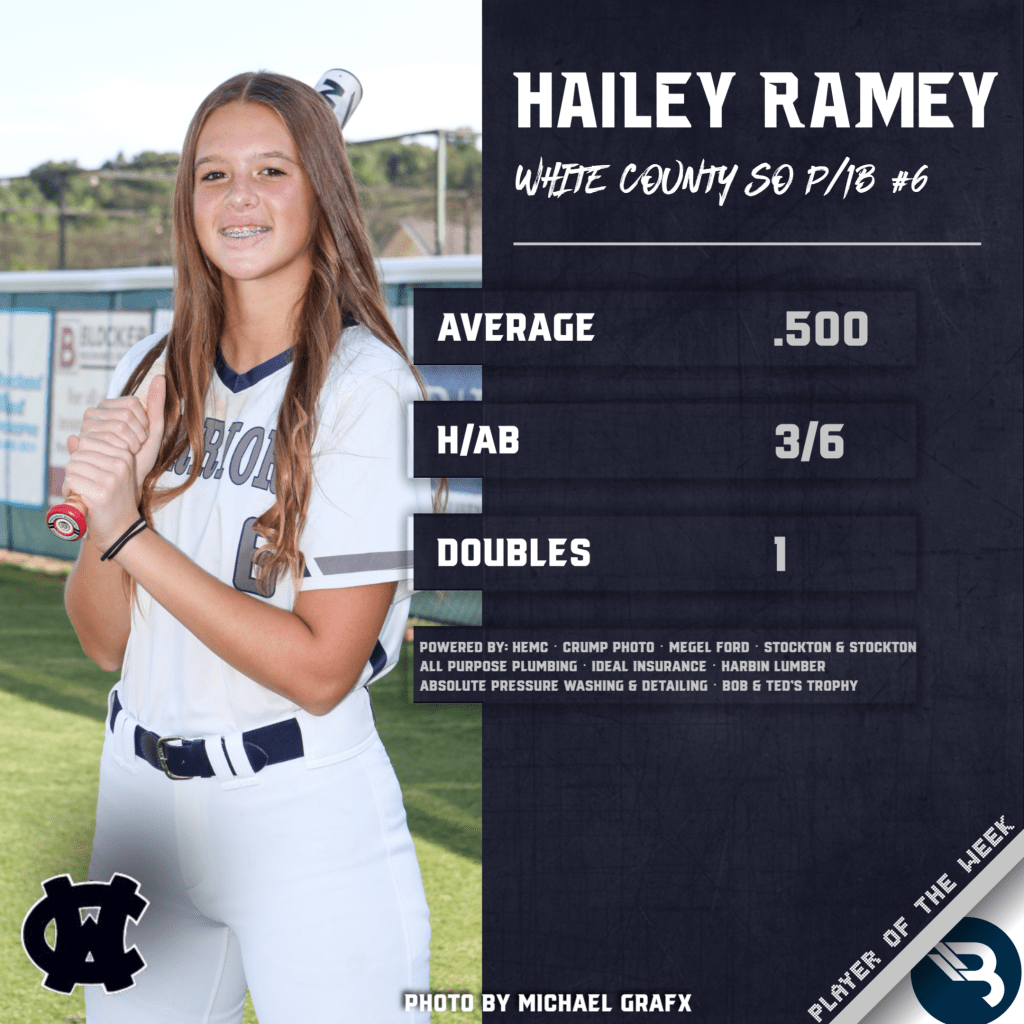 Hailey Ramey opened up her 2022 season with a 3-for-6 performance at the dish, batting .500 as a result. The White County Lady Warriors standout pitcher/first baseman added a double, earning her first Player of the Week award.