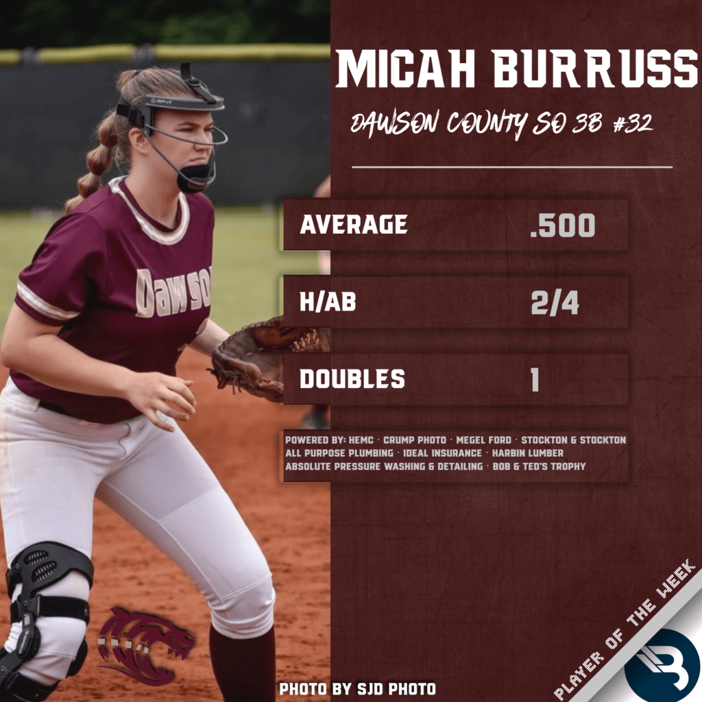 Micah Burruss earns her first Player of the Week award after the third baseman batted .500 (going 2-for-4) in last week’s early action for Dawson County. The sophomore had a double as part of her efforts for the Lady Tigers.
