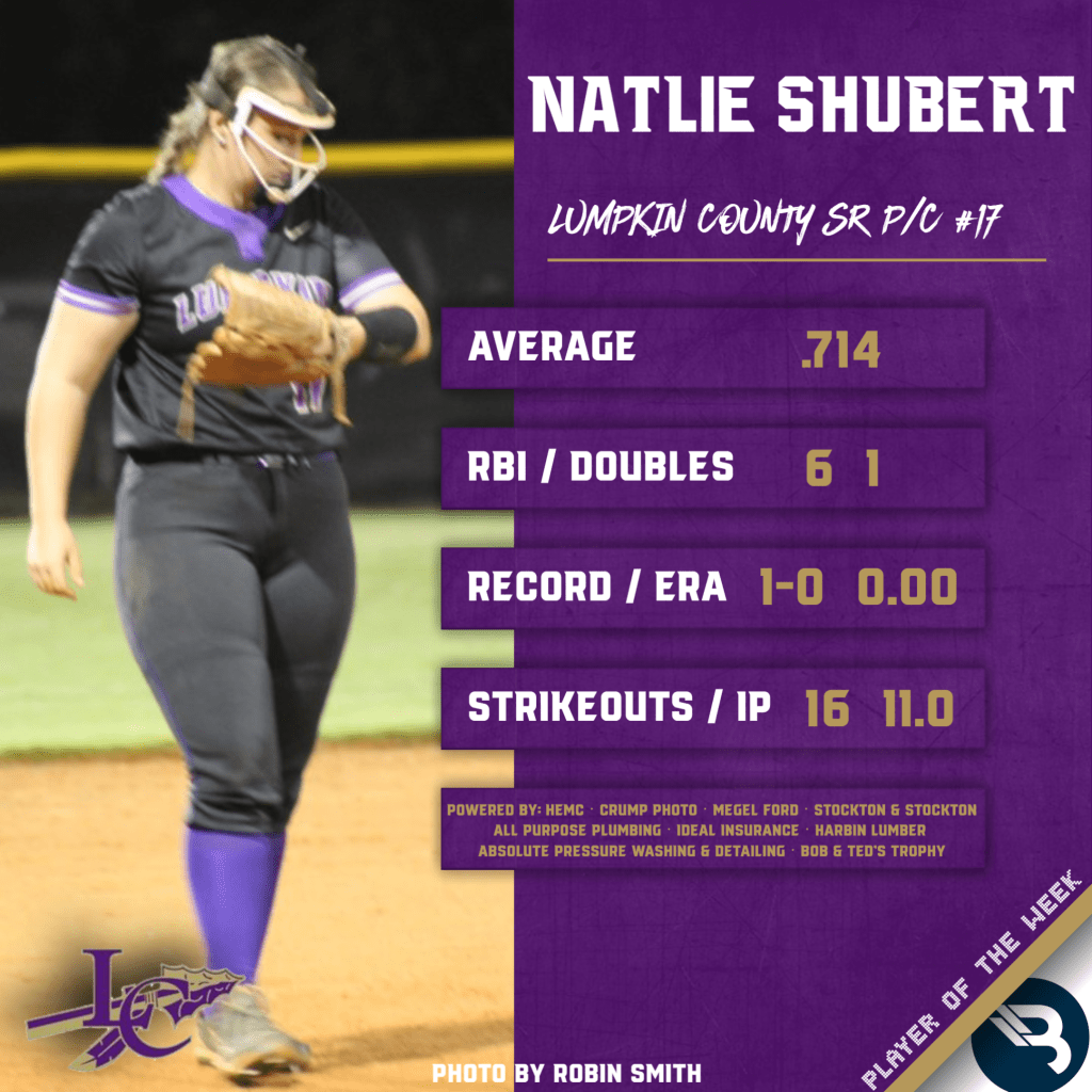 Natalie Shubert had a stellar week both at the plate and in the circle last week. The senior pitcher and catcher led Lumpkin County by going 5-for-7 at the plate, good for a .714 batting average. She drove in six runs and notched a double. She was arguably more dominant in the circle, going 1-0 with a 0.00 ERA and 16 strikeouts across 11 innings of work. This is Shubert’s first POW award.
