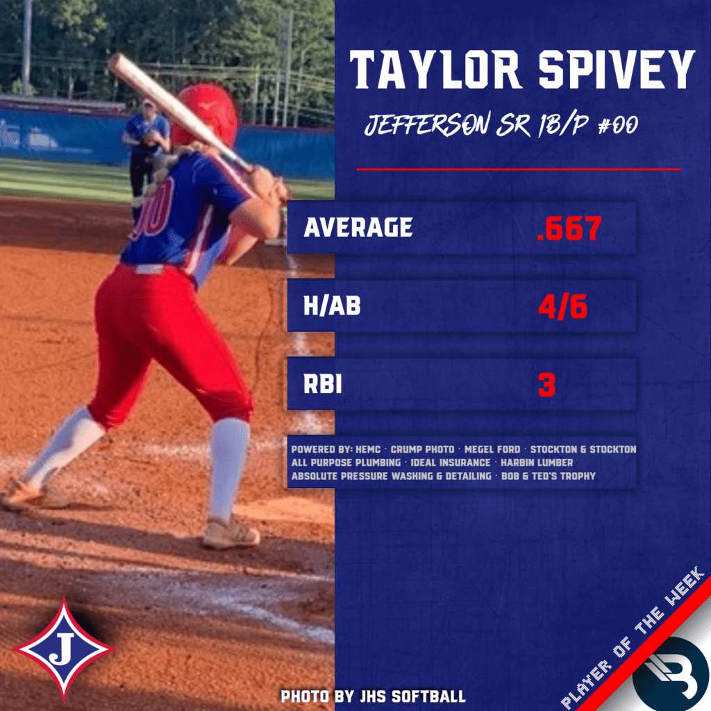 Senior Taylor Spivey came up HUGE with a walkoff hit against Oconee County for the Lady Dragons last week. That was just part of her great effort, as the firstbaseman hit .667 (4-for-6), including three RBIs. Spivey earns her second career POW award.