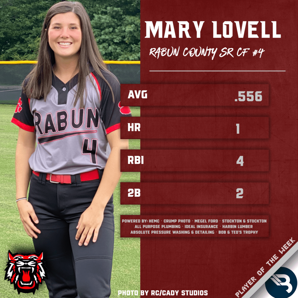 Senior centerfielder Mary Lovell had a stellar showing for the Lady Wildcats last week. The Rabun County standout went 5-for-9 at the plate, good for a .556 average. She had a homerun, 4 RBI, and 2 doubles, posting a 1.667 OPS in 3 games. This is her second career POW award.