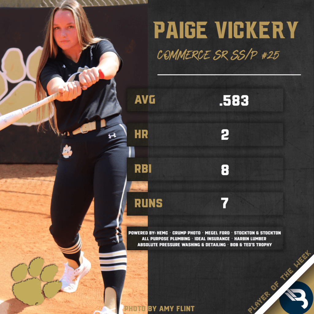 Paige Vickery has gotten off to a blistering start to the 2022 season. She’s putting up Player of the Year type of numbers. Last week is the latest exhibit of that. She batted .583, which is insane, going 7-for-12. That included 2 homers, which gives her 4 already on the season. She added 8 RBI, 7 runs, 2 doubles, 2 triples, and 2 walks in 3 games of work. Those are video game numbers. The Lady Tigers senior shortstop earns her first POW award.