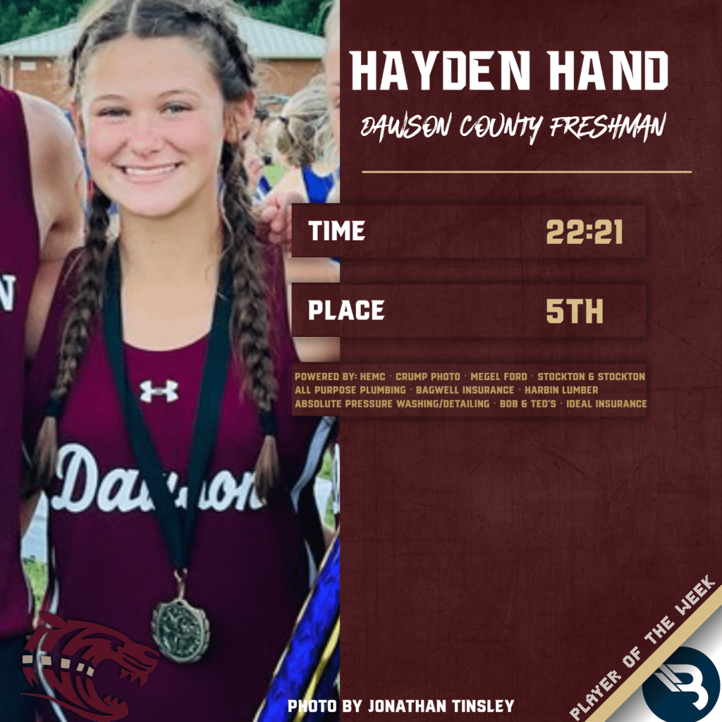 Hayden Hand picks up an early Runner of the Week award after placing 5th at Wesleyan for Dawson County last week. The freshman, who was a star at the MS level, finished the meet with a time of 22:21, claiming the first of hopefully many Runner of the Week awards for her.