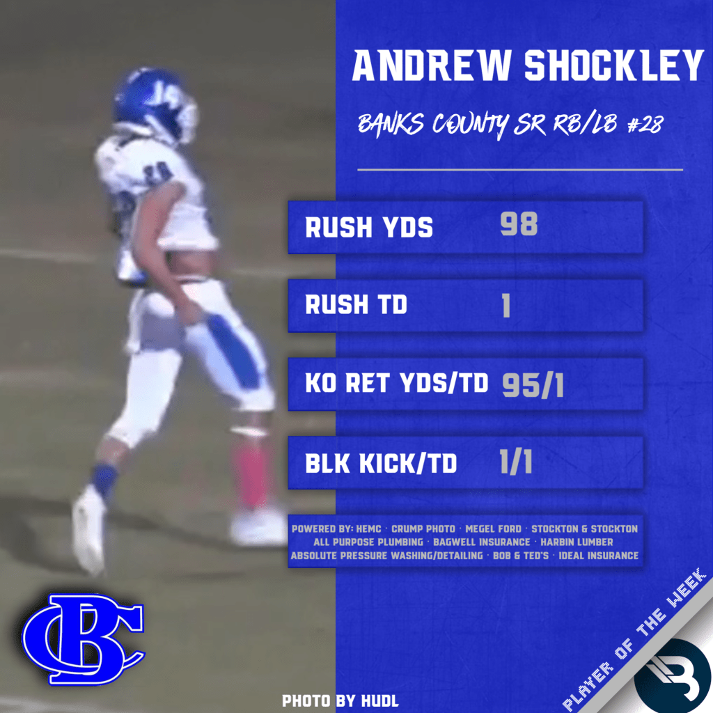This guy just keeps raking! The senior star for the Leopards is putting up cheat code numbers, and last week scored in 3 different ways for undefeated Banks County. Shockley rushed for 98 yards and a TD, returned a kick for a 95-yd TD, and blocked a kick and returned it 80 yards for a TD as well. He’s insanely good! This is Shockley’s third career POW award.