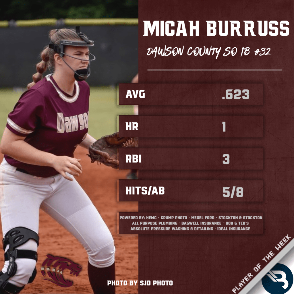 The BLITZ Fan Vote for Softball Player of the Week saw 19,788 votes come in, with Micah Burruss (Dawson County) taking the most at 11,055. BLITZ then named Bailey Barfield (Habersham Central) as Co-POW.