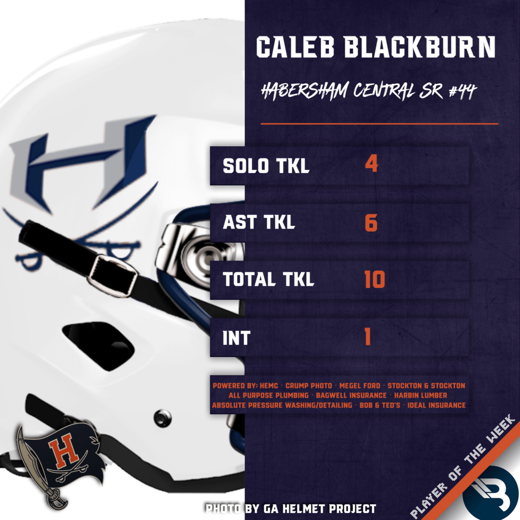 Senior Caleb Blackburn left nothing back in Habersham Central’s game in Week Seven. The defensive standout registered 10 total tackles, and hauled in an interception for the Raiders. This is Blackburn’s first POW award.