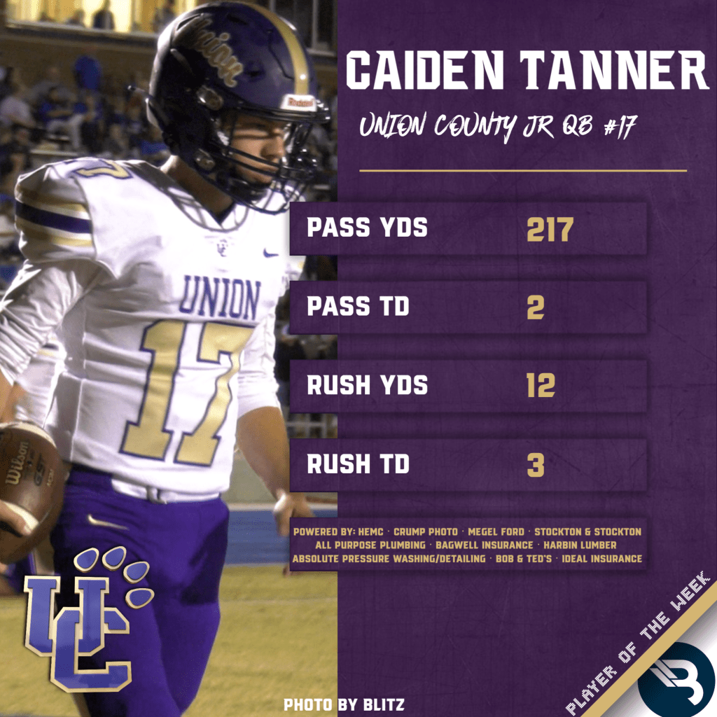 Caiden Tanner put on a clinic in Union County’s win at Banks County in Week Eight. The junior signal-caller totaled 5 TDs and 229 yards. He threw for 217 and 2 TD, and rushed for 12 and 3 scores. This is Tanner’s first POW award.