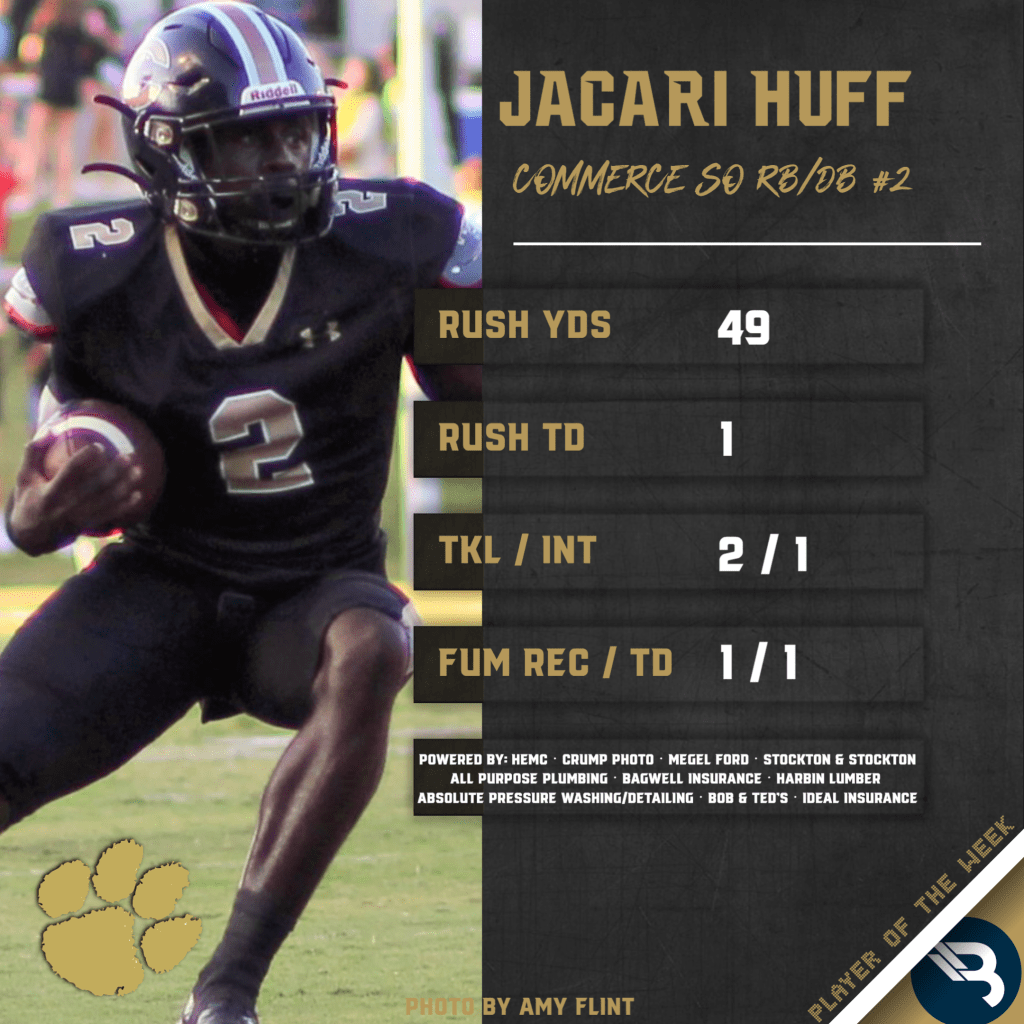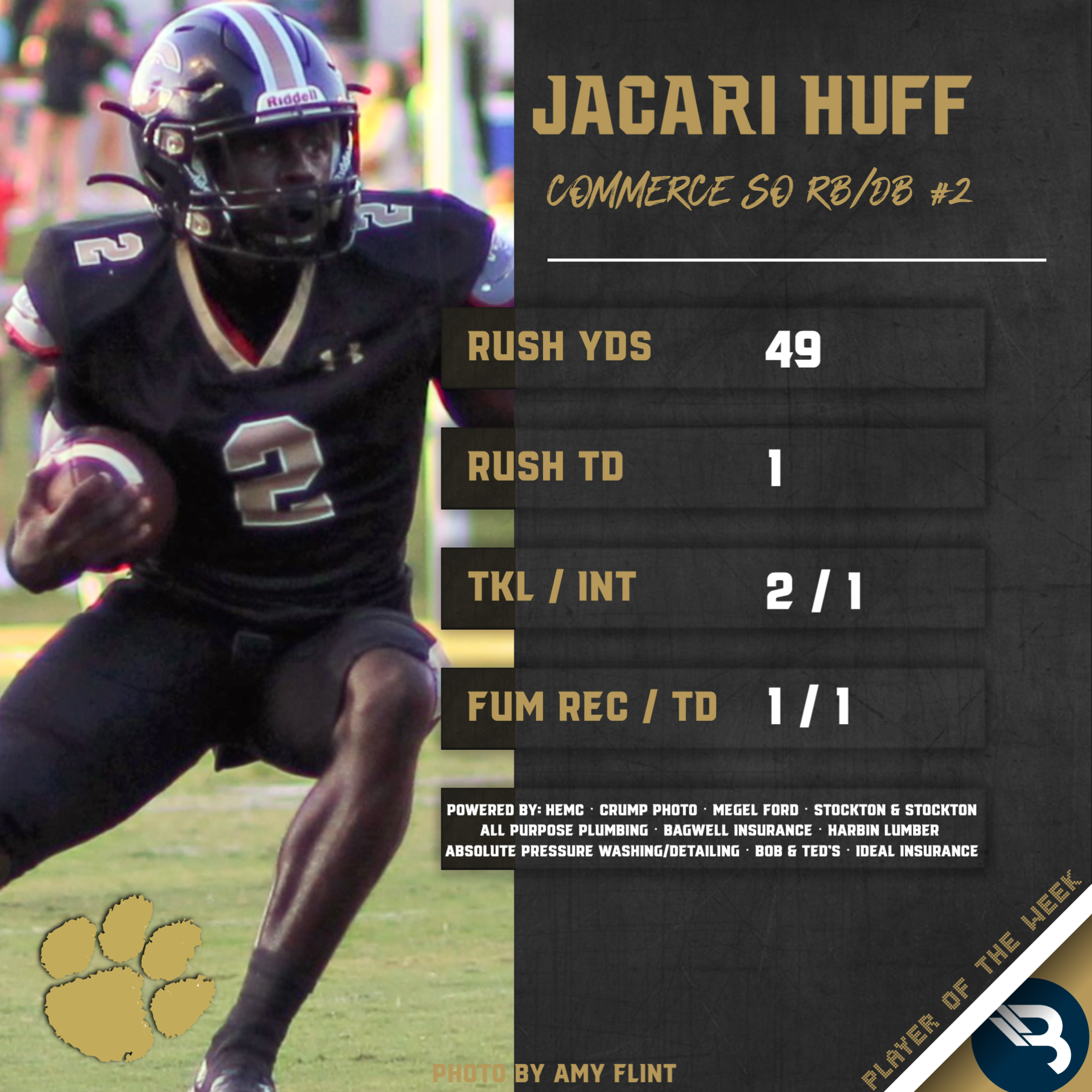 Jacari Huff was unstoppable for the Tigers in their win over #9 Social Circle last week. The sophomore racked up 49 rushing yds and a TD, had 2 tackles, an interception, and a scoop-and-score fumble recovery for a TD. This is Huff’s first POW award.