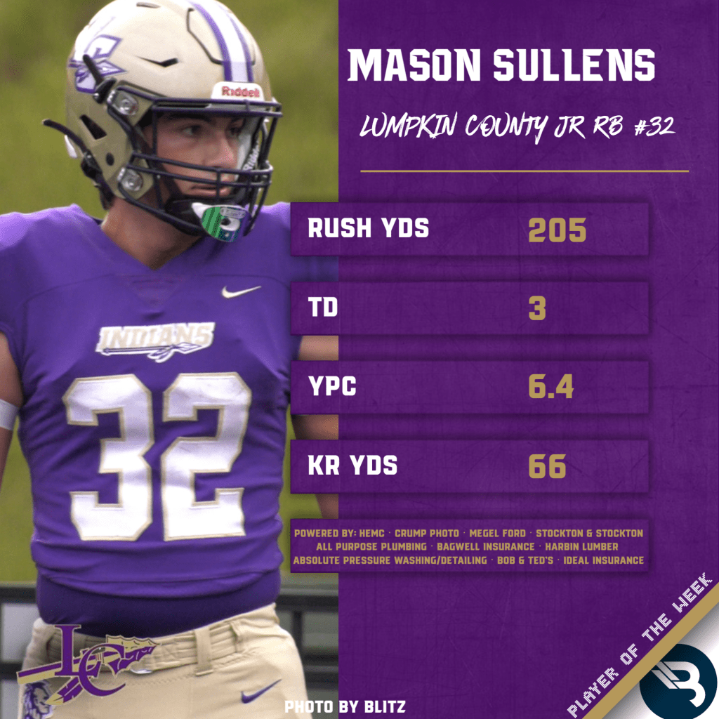 Junior Mason Sullens has been deserving of this honor all season long. He finally gets POW honors after an elite performance at #9 Gilmer, in which the power back tallied 205 rushing yards and 3 TD for the Indians in their statement win. He averaged 6.4 yards per tote, and added 66 kick return yards for a ridiculous 271 total yards.