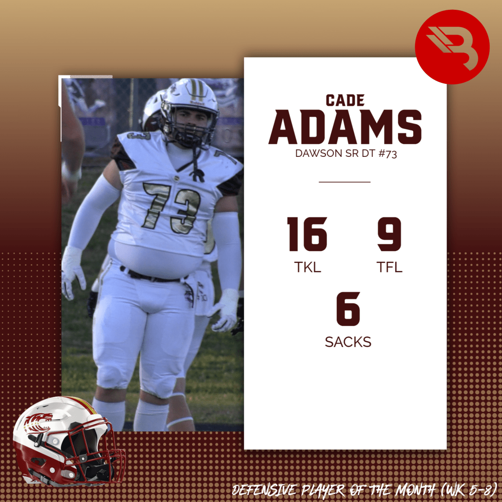 The BLITZ Fan Vote for Football Defensive Player of the Month (Weeks 5-8) saw 23,422 votes come in, with Jay Grizzle (Lumpkin County) taking the most at 11,970. BLITZ then named Cade Adams (Dawson County) as Co-DPOM.