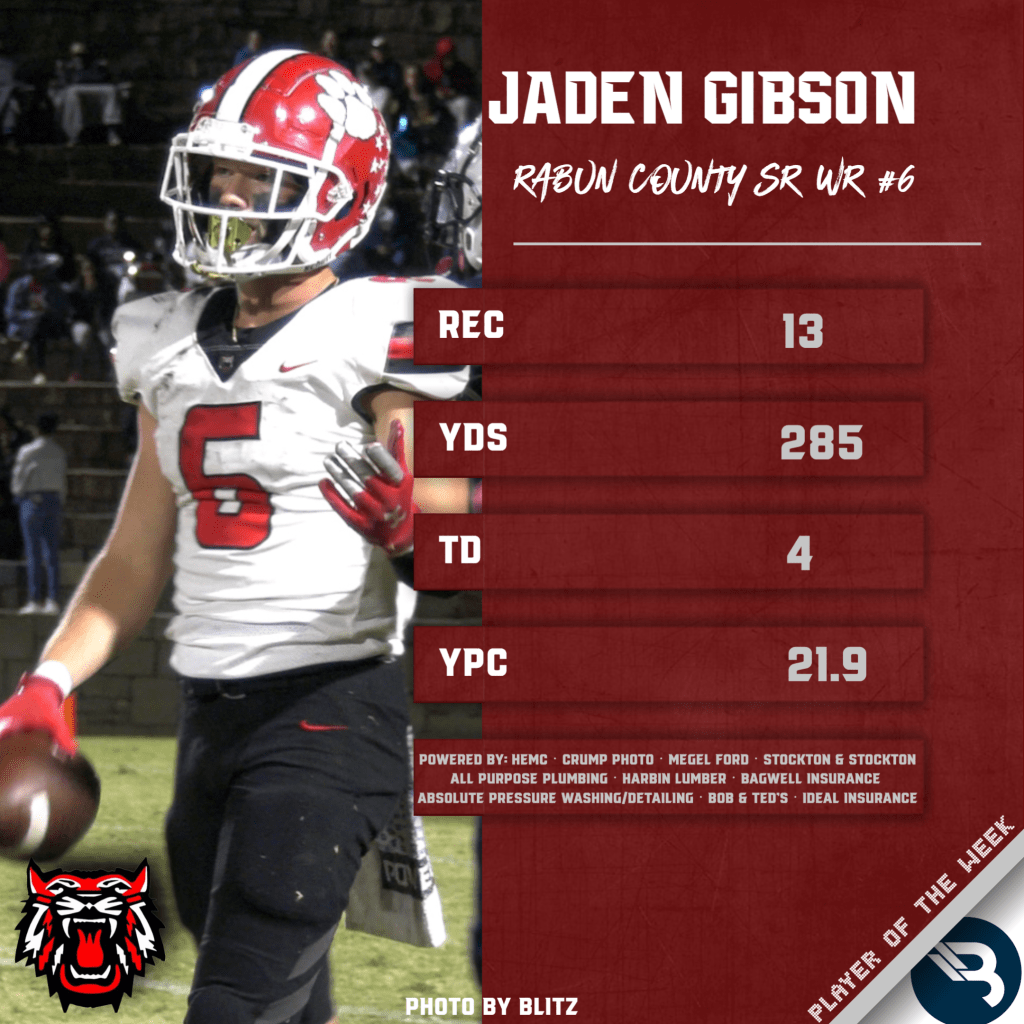 The night that Jaden Gibson had was one that even he might not be able to duplicate. The state’s all-time best receiver now leaves it undebatable. The Georgia Southern commit went into a big-time showdown between #2 Rabun County and #6 Elbert County in a battle of unbeatens at The Granite Bowl in Elberton. The result? A 41-21 Wildcats win to make a huge statement. What’s more, the star senior WR needed 225 yards and 3 TD to tie the all-time state records in both receiving yards and receving TD. He went for 285 and 4 to claim the top spot all-time in both. He hauled in 13 catches, several highlight-worthy, and averaged 21.9 yards per catch. Gibson now has 1,363 yards on the season and tied his career-high of 19 TD. He has 4,537 career yards and 49 and at minimum 3 more games, and almost 100% he’s got something closer to 5-7 games left to put those totals so far out of reach. This is Gibson’s 7th POW award all-time, making him the fourth-most decorated football player in BLITZ history behind other Rabun greats Gunner Stockton, Bailey Fisher, and Austin Jones.
