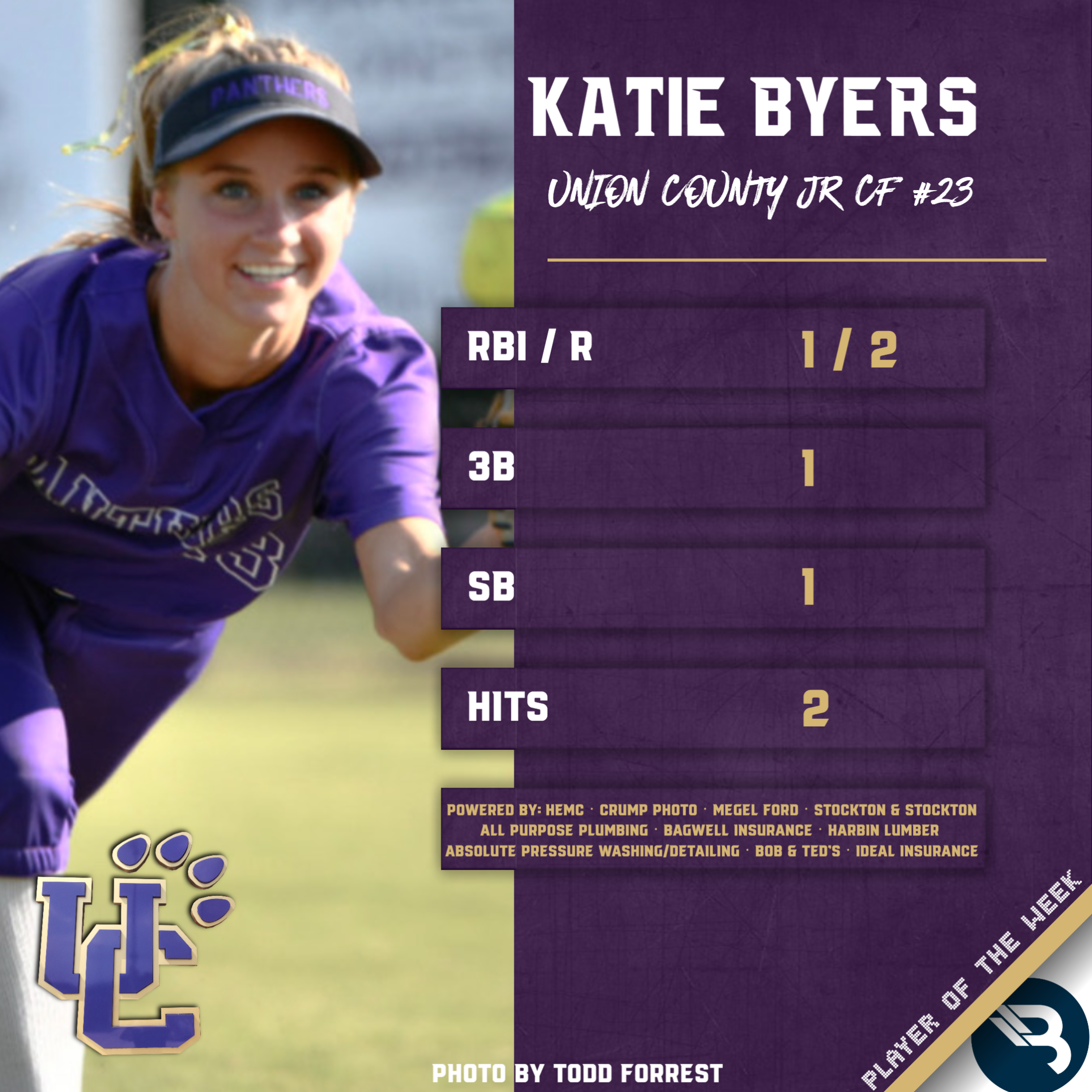 Katie Byers put in a great performance for Union County in the Lady Panthers’ drive for a region title. The junior centerfielder had a couple of hits, scored twice, drove in a run, and had a triple and stolen base. This is Byers’ first POW award.