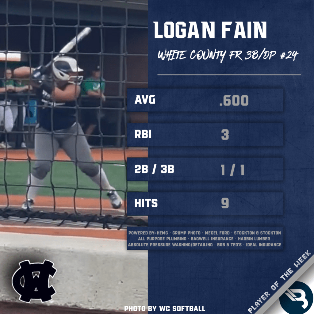 White County always seems to churn out new talented players. Meet the latest. Freshman 3B Logan Fain carries a powerful bat, and showed it last week for the Lady Warriors. In 3 games, Fain was 9-for-15 for a .600 average, driving in 3 runs while collecting a double and a triple. This is Fain’s first POW award.