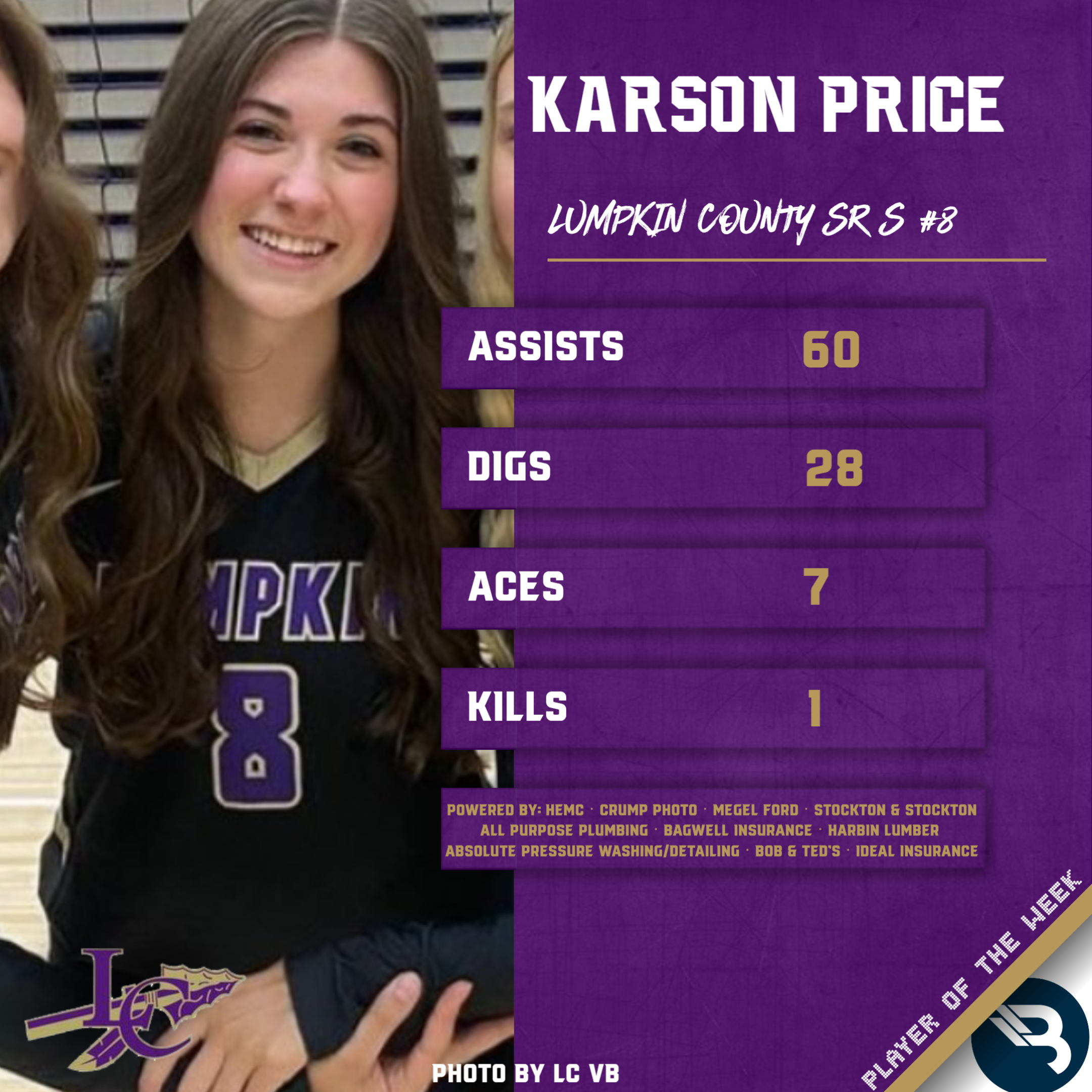 Karson Price had a standout 4 matches for Lumpkin County last week. The senior setter came up with 60 assists, 28 digs, 7 aces, a kill, and a block for the Lady Indians. This is Price’s first POW award.