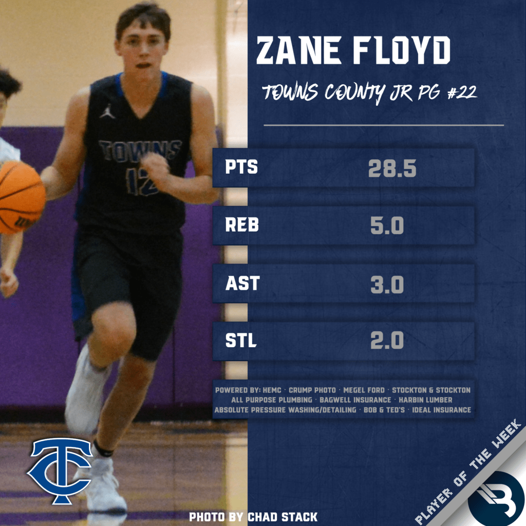 Zane Floyd has gotten off to a great start in his junior campaign. The Towns County junior guard averaged 28.5 points, 5 rebounds, 3 assists, and 2 steals per game in the Indians’ 2 games last week. This is Floyd’s second career POW award.
