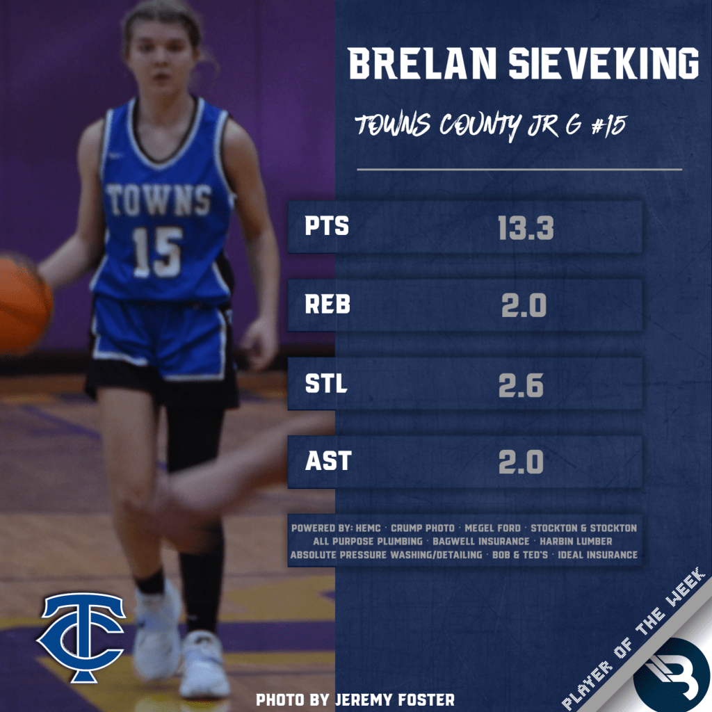 The BLITZ Fan Vote for Basketball Player of the Week (combined boys/girls) was Brelan Sieveking (Towns County) after taking 2,265 of the 3,823 total votes. BLITZ then named Cooper Welch (Rabun County) as Co-POW.