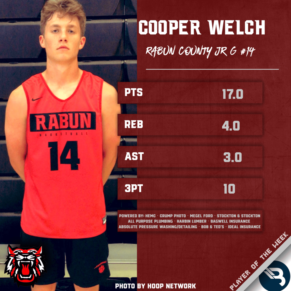 Rabun County’s Cooper Welch has elevated his game as of late. The junior guard averaged 17 points, 4 rebounds, 3 assists, 2 blocks, and connected on 10 total 3-pointers across three games in the Battle of the States Tournament in Towns County. He was named BOS Tournament MVP for his efforts, as the Wildcats earned the signature win. This is Welch’s first POW award.